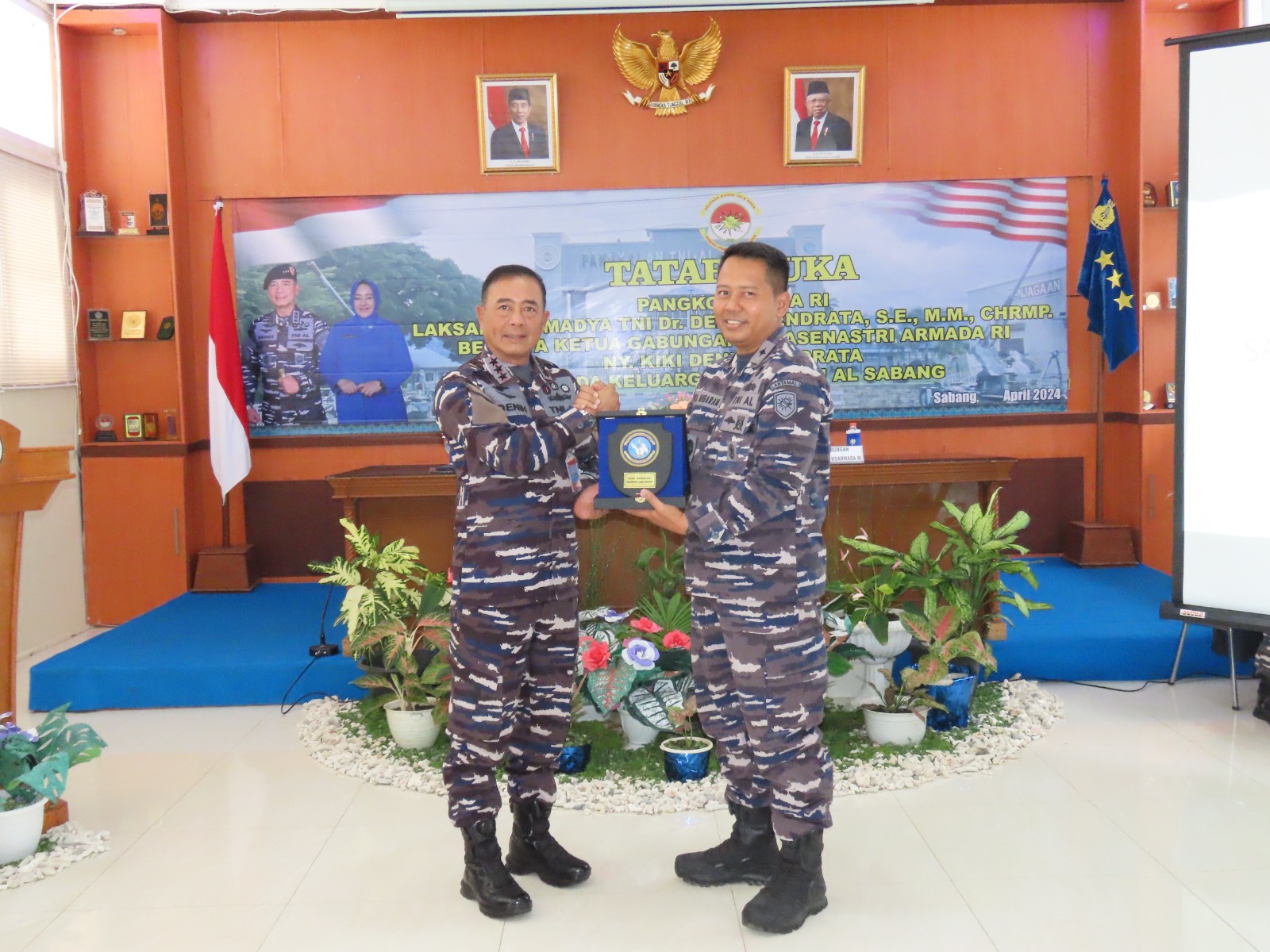 Palapanews – TNI AL Sabang, Komandan Pangkalan TNI Angkatan Laut Sabang (Danlanal) Kolonel Laut (P) Gita Muharam, M. Sc., didampingi Ketua Jalasenastri Cabang 3 Korcab I DJA I, Ny. Tika Gita Muharam, menerima kunjungan kerja Panglima Komando Armada Republik Indonesia (Pangkarmada RI) Laksamana Madya TNI Dr. Denih Hendrata, S.E., M.M., CHRMP., didampingi Ketua Gabungan Jalasenastri Armada RI Ny. Kiki Denih Hendrata beserta rombongan, bertempat di Lounge room Mako Lanal Sabang, Jalan Yos Sudarso, Gampong Kuta Ateuh, Kecamatan Sukakarya, Kota Sabang, Sabtu (27/04/2024).