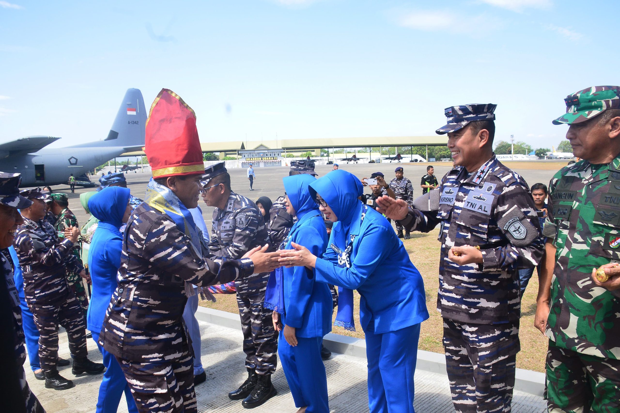 Kegiatan kunjungan kerja Kasal dan Ketua Umum Jalasenastri beserta rombongan diawali dengan penyambutan oleh Danlantamal VI dan Forkopimda Sulsel di Base Ops Lanud Hasanuddin Makassar.