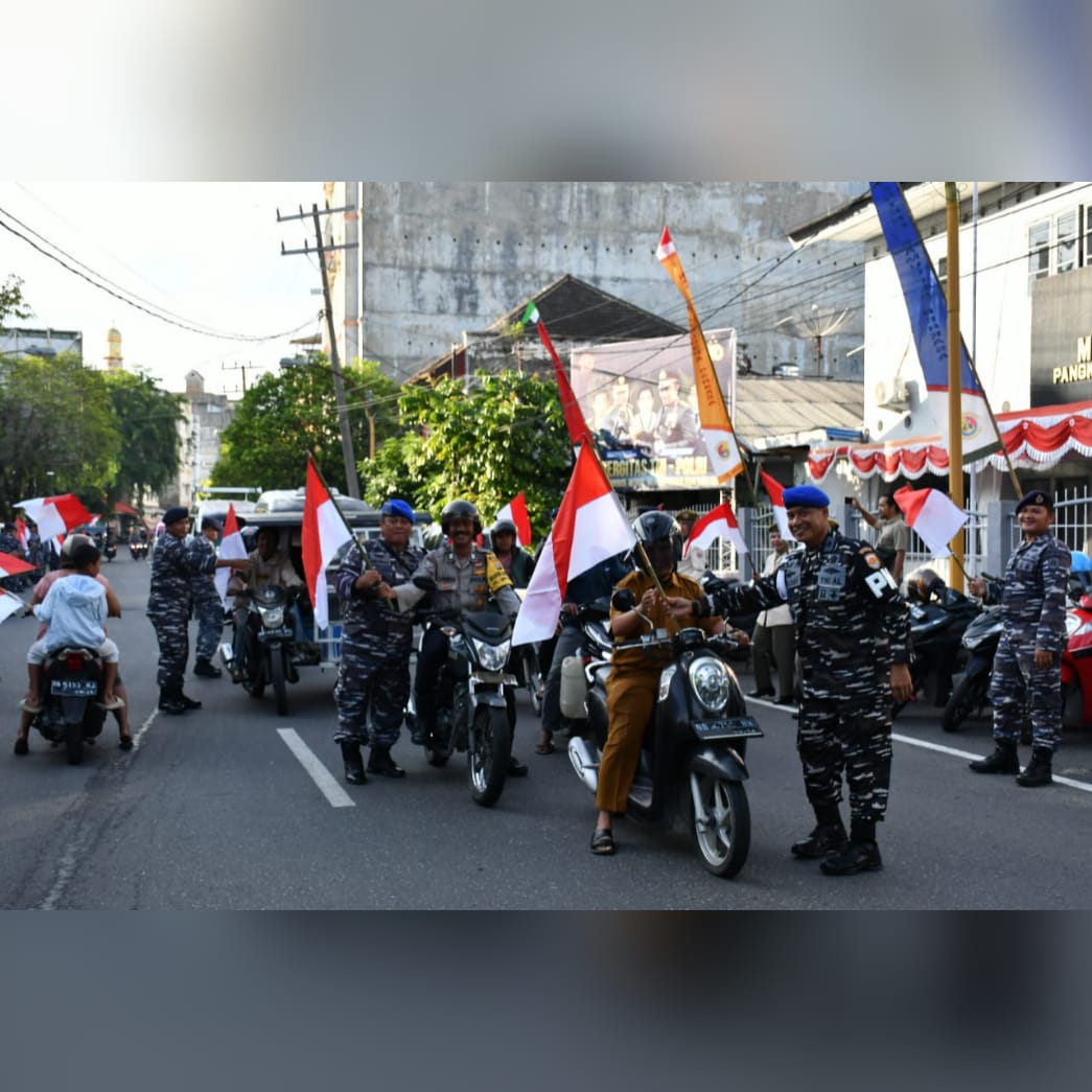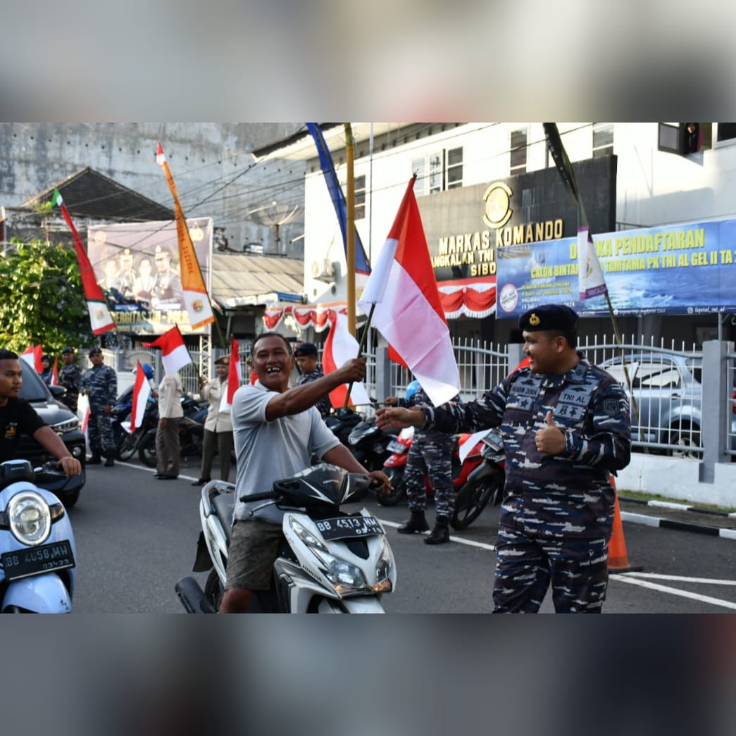 Komandan Lanal Sibolga Letkol Laut (P) Robiyanto, S.H., M.Tr. Hanla., memimpin Prajurit Benteng Samudra Perkasa Lanal Sibolga membagikan Bendera Merah Putih dengan ukuran sedang sebanyak 79 buah dan bendera kecil sebanyak 100 buah di depan Mako Lanal Sibolga, Jalan S. Parman, Ps. Belakang Sibolga Kota.
