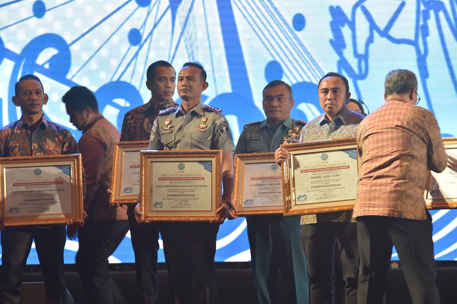 Penghargaan diberikan langsung oleh Direktur Peran Serta Masyarakat BNN RI Drs. Yuki Ruchimat, M.Si., kepada Danlatamal l yang diwakili oleh Wadan Lantamal l Kolonel Laut (P) Siswo Widodo, S.T.