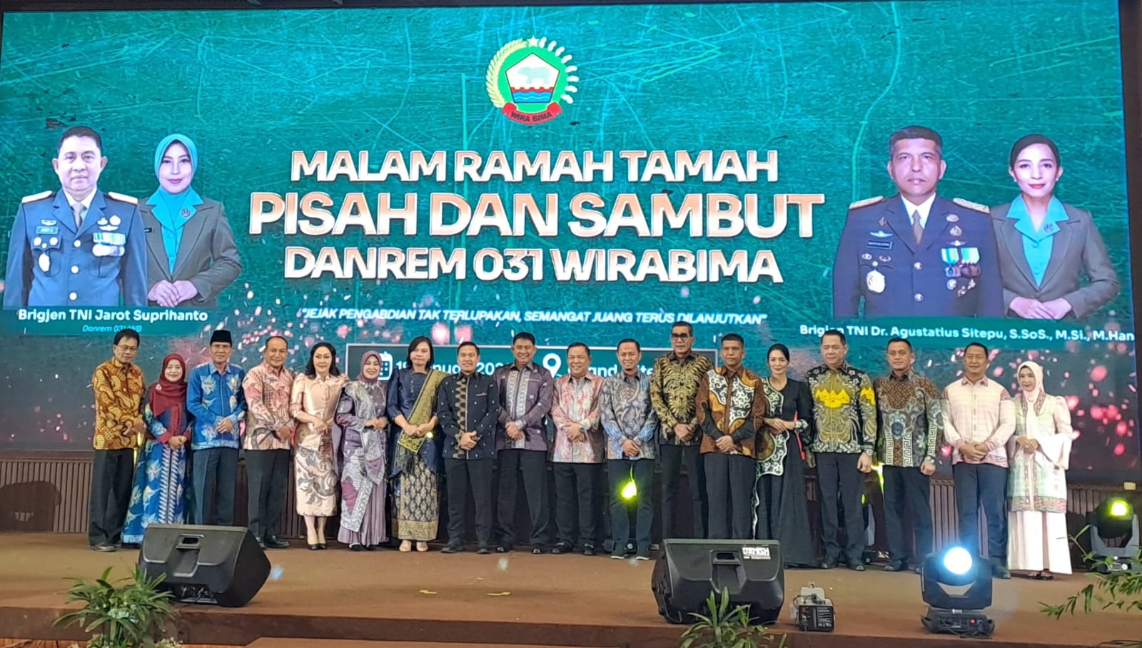 Dalam suasana penuh kehangatan dan kebersamaan, jajaran TNI/Polri, pemerintah daerah, serta unsur Forkopimda Provinsi Riau berkumpul dalam sebuah malam ramah tamah pisah sambut Komandan Korem 031/Wira Bima, sebagai bentuk penghormatan dan apresiasi atas pengabdian Brigjen TNI Jarot Suprihanto selama menjabat sebagai Danrem 031/Wira Bima, sekaligus penyambutan resmi Brigjen TNI Dr. Agustatius Sitepu sebagai pejabat Danrem yang baru.